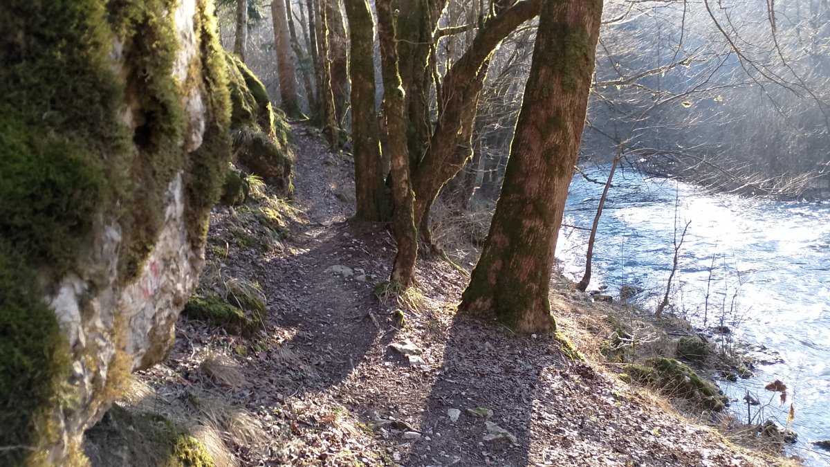 There is a 15m cliff here where you follow the river and you could go right instead of left and end up looking over the cliff over the river, where you would have to really hang on to continue along the rock line..