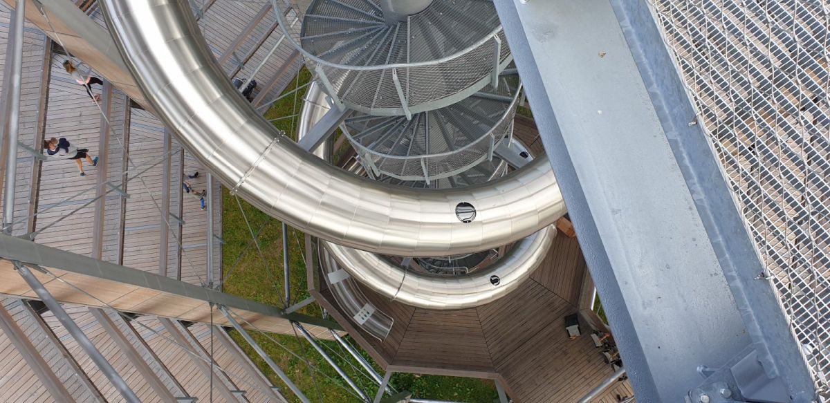 Don't forget to pick up a mat as you get to the start of boardwalk up the structure, (there are some spare ones at the top if you do change your mind). The boardwalk curves around this long bendy human sized tube and once at the top you can decide to pay a few extra Euros and put your feet in what can be best described as a shiny sack, then glide off to be swallowed by the hole, hurtling down this metal tube screaming wildly to your certain death!