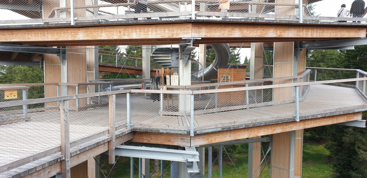 There are many viewpoints and angles to enjoy from up here, but the highlight.. literally.. is the big car park at the end.. you walk around and up and up and around to the top wooden platform with this massive metal tube spiralling down the centre of the structure.