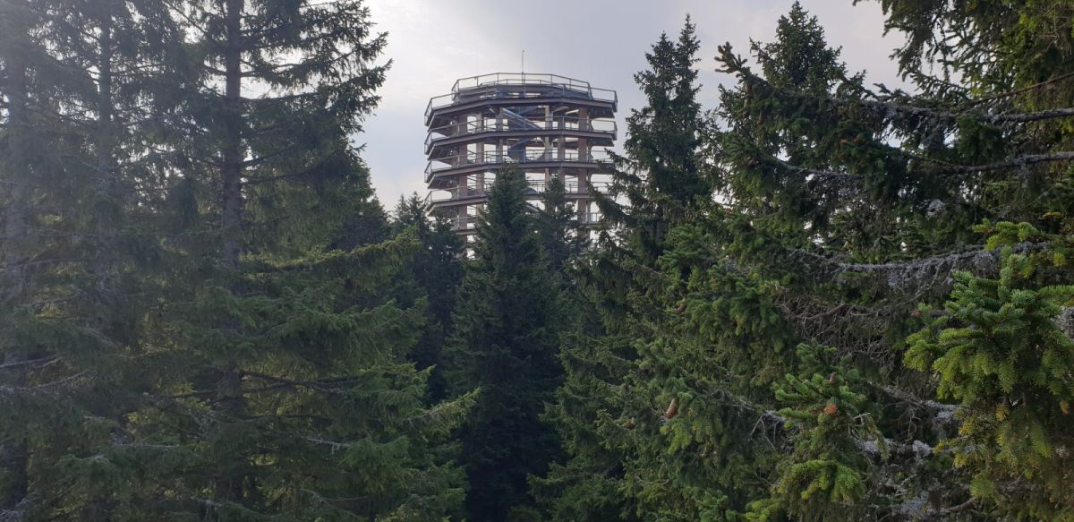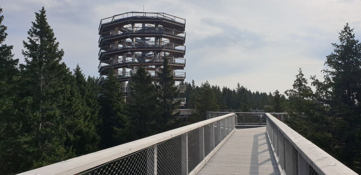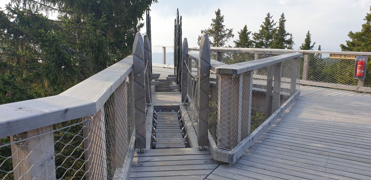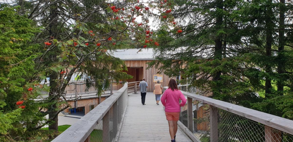 There are ski lifts and hotels all over the place up here and a long road with spaces all along to park at.. you won't miss the Tree Top Walk, the tower looks a bit like a huge car park in the sky! There is a visitor centre over the road and you go in here to access the walk and then go onto the walkway bridge over the road.