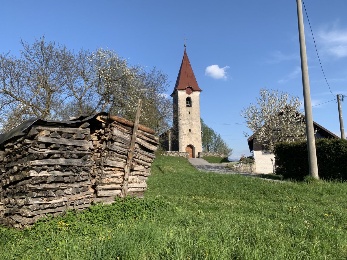 Follow the route carefully into the forest to reach a final small hill, where better to leave the bikes at the bottom and trek the 100m or so to the top, as the path is really quite tricky here for a bike, but pops out to a mountain clearing where the St Lawrence church sits with stunning views down into the green valley.